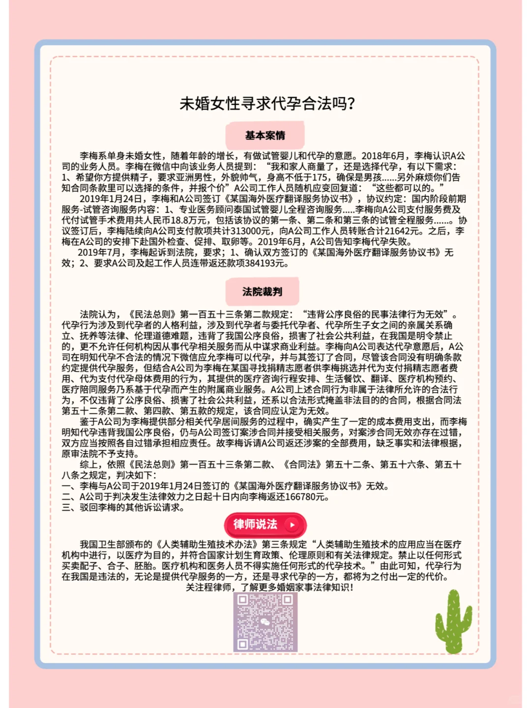 李梅系单身未婚女性,随着年龄的增长,有做试管婴儿和代孕的意愿。2018年6月,李梅认识A公司的业务人员。李梅在微信中向该业务人员提到:“我和家人商量了,还是选择代孕,有以下需求:1、希望你方提供精子,要求亚洲男性,外貌帅气,身高不低于175,确保是男孩......另外麻烦你们告知合同条款里可以选择的条件,并报个价”A公司工作人员随机应变回复道:“这些都可以的。”